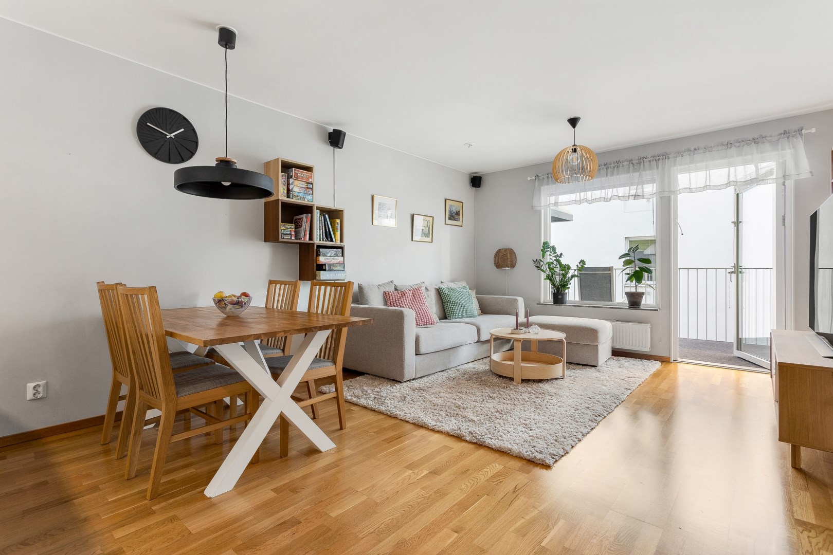 Perfekt planerad tvåa med attraktivt läge! Den stora balkongen rymmer både matgrupp och loungemöbler och erbjuder ett insynsskyddat, ljust och trivsamt uterum. Vardagsrum och kök ligger i öppen planlösning och har direkt utgång till balkongen. Det rymliga sovrummet har gott om plats för