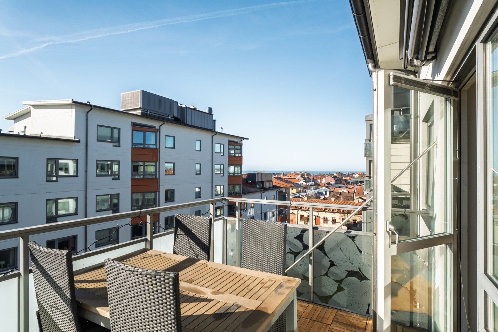 Högst upp i huset Balkong i söderläge Vacker havsutsikt Öppen planlösning Stilrent kök Rymlig klädkammare Helkaklat badrum Egen tvättutrustning Hiss i huset Direkt access till garage Centralt läge i Varberg Promenadavstånd till havet Nära torget och restauranger Påskbergsskogen inom räckhåll