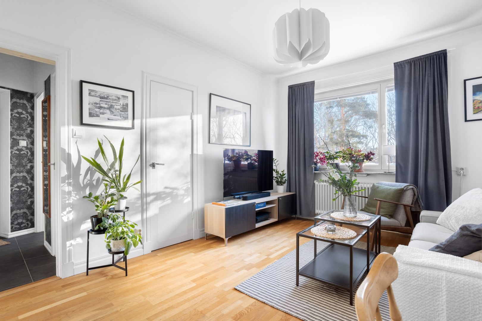 En halvtrappa upp finner du denna ljusa gaveltvåa med fönster i tre väderstreck! Eftersom byggnaden är belägen på en kulle får ni en fin utsikt över Johannesfred, precis som om ni vore högt uppe i huset. 2 rum och Kök Både sommar- och vintertid erbjuder Johannesfred en mycket trevlig strandpromenad