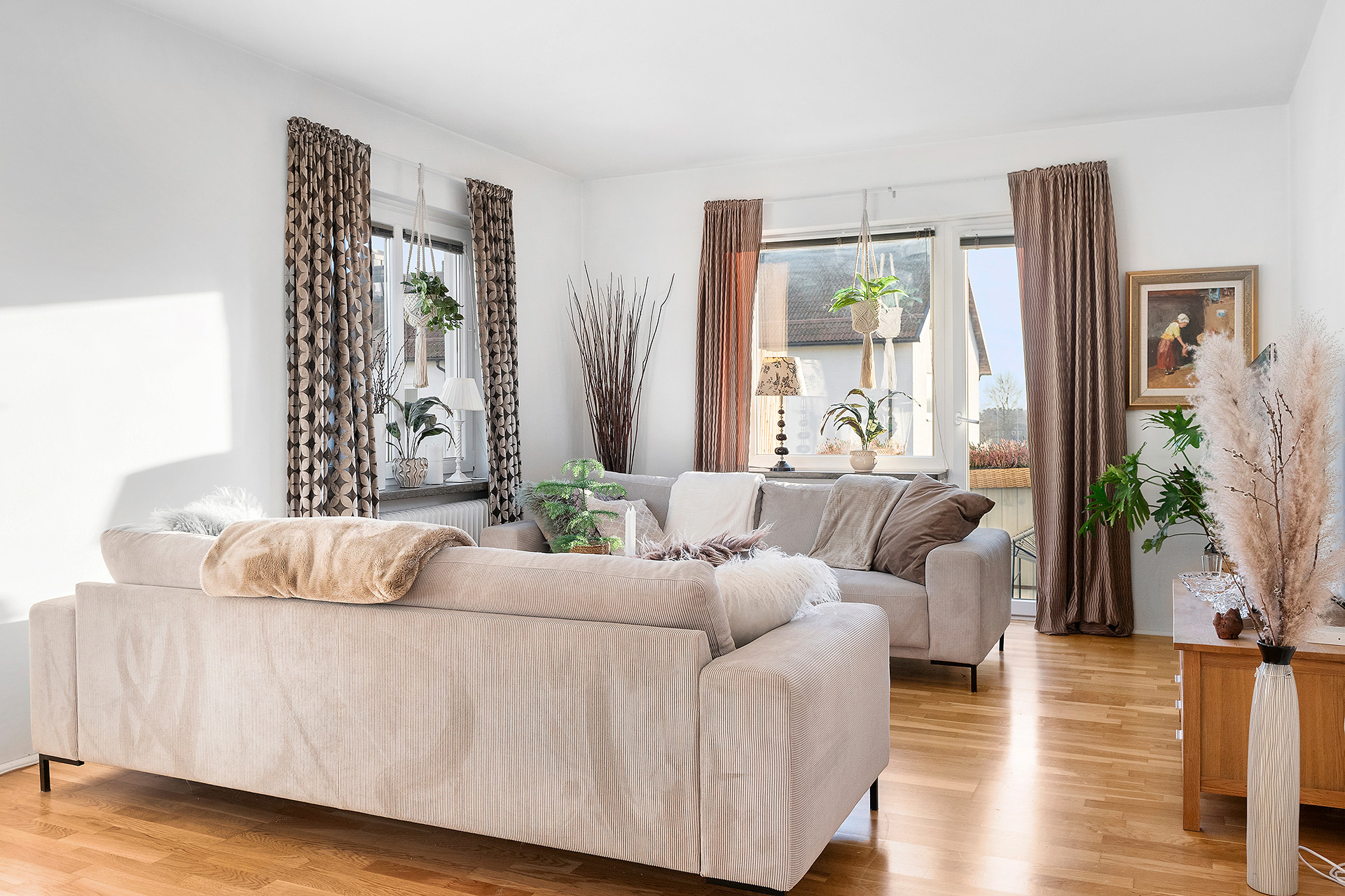 Välplanerad och ljus trerummare i ostört läge högst upp i huset. 71 kvadratmeter med gavelläge och fönster i tre väderstreck ger ett härligt ljusflöde och skapar en luftig och trivsam atmosfär. Lägenheten har en praktisk planlösning med två rymliga sovrum, ett stort vardagsrum med utgång till en