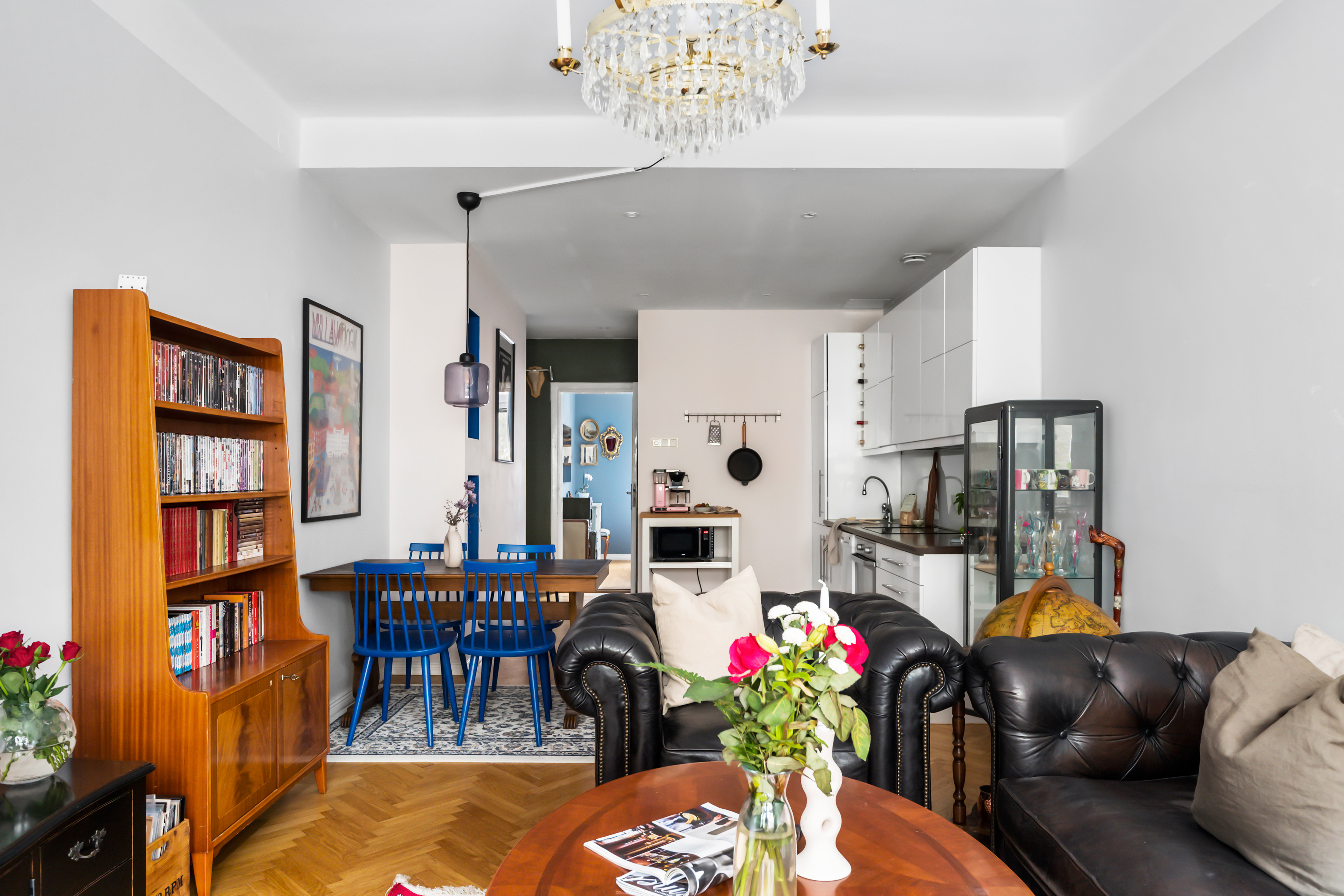På våning två välkomnas vi in i en genomgående bostad i ett klassiskt 1930-talshus. Bostaden erbjuder en välkomnande hall med plats för avhängning, här finns även bostadens helkaklade och fräscha badrum. Från hallen nås två olika rum, idag fördelade på ett arbetsrum och ett sovrum, båda med