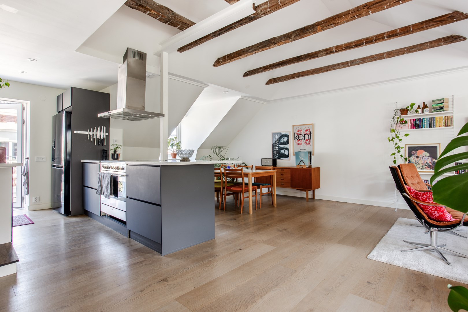 Synliga takbjälkar och öppet upp i nock. Genomgående ljusinsläpp och dubbla balkonger. Välkommen till denna karaktärsfyllda och moderna vindslägenhet på Brommagatan 7 intill Vikingsbergsparken! Precis ovanför Tågabacken ligger denna läckra vindslägenhet vars kvadratmetrar breder ut sig över hela