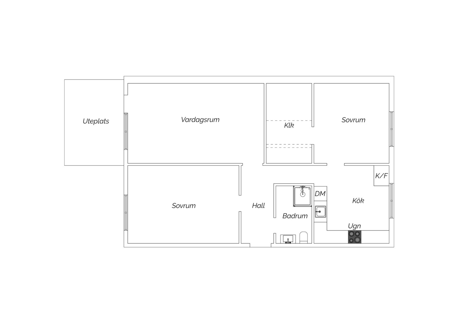 Solig uteplats i söderläge med direkt access till gräsplätten utanför Lugnt och grönt läge i omtyckta Östra Torn Genomtänkt planlösning med separata sovrum och sociala ytor Två rymliga sovrum, varav ett med tillgång till walk in closet/extra rum Stilrent badrum med kakel och klinker, dusch och