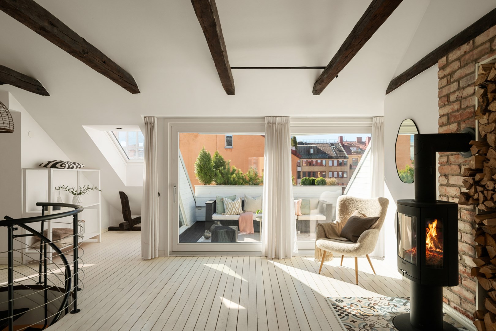 Välkomna till en exklusiv vindsetage med stor och solig takterrass som skapar en privat urban oas, samt balkong och braskamin högst upp i ett mycket lugnt gårdshus. Den generösa totala golvytan om ca 100 m² skapar en luftig och rymlig bostad med flera extra användbara ytor utöver boarean om 79