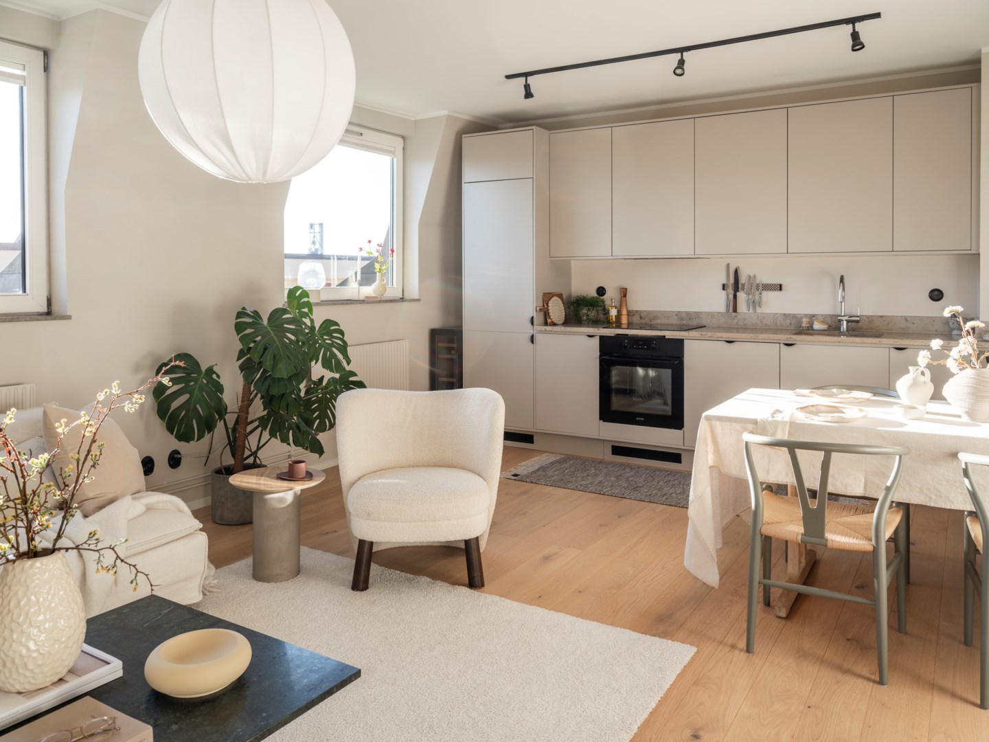 Högst upp i ett hus från 1881 ligger denna takvåning om 57 kvm, disponerad som en 3:a. Bostaden är i mycket gott skick efter en totalrenovering 2021 med ljusa och enhetliga materialval, såsom kalksten i kök och badrum, ekparkett och beige väggar. Fönster i både norr och söder ger bra ljus och utsikt