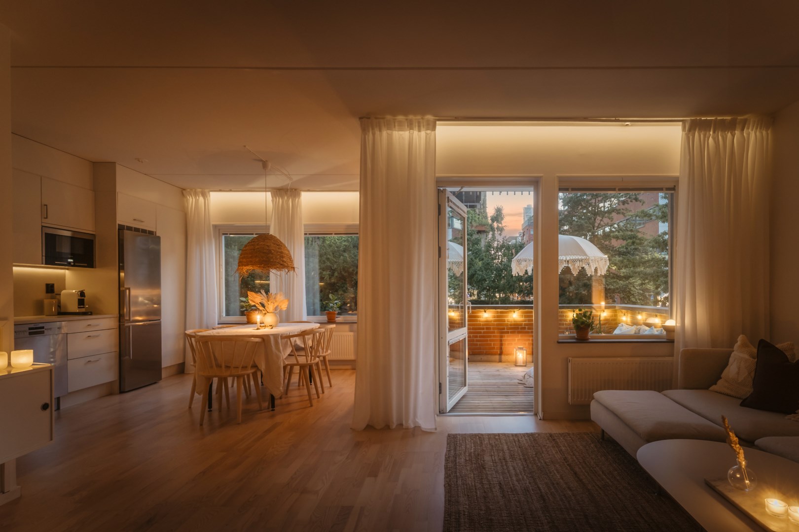 Öppen planlösning Generösa fönsterpartier Attraktivt hörnläge Enhetlig interiör Uteplats i västerläge Inbjudande atmosfär Fint naturligt ljusinsläpp Modernt & ljust Trendigt badrum Egen tvättutrustning Gemensam takterrass i brf Gästrum i förening Havsnära läge Bra restaurangutbud