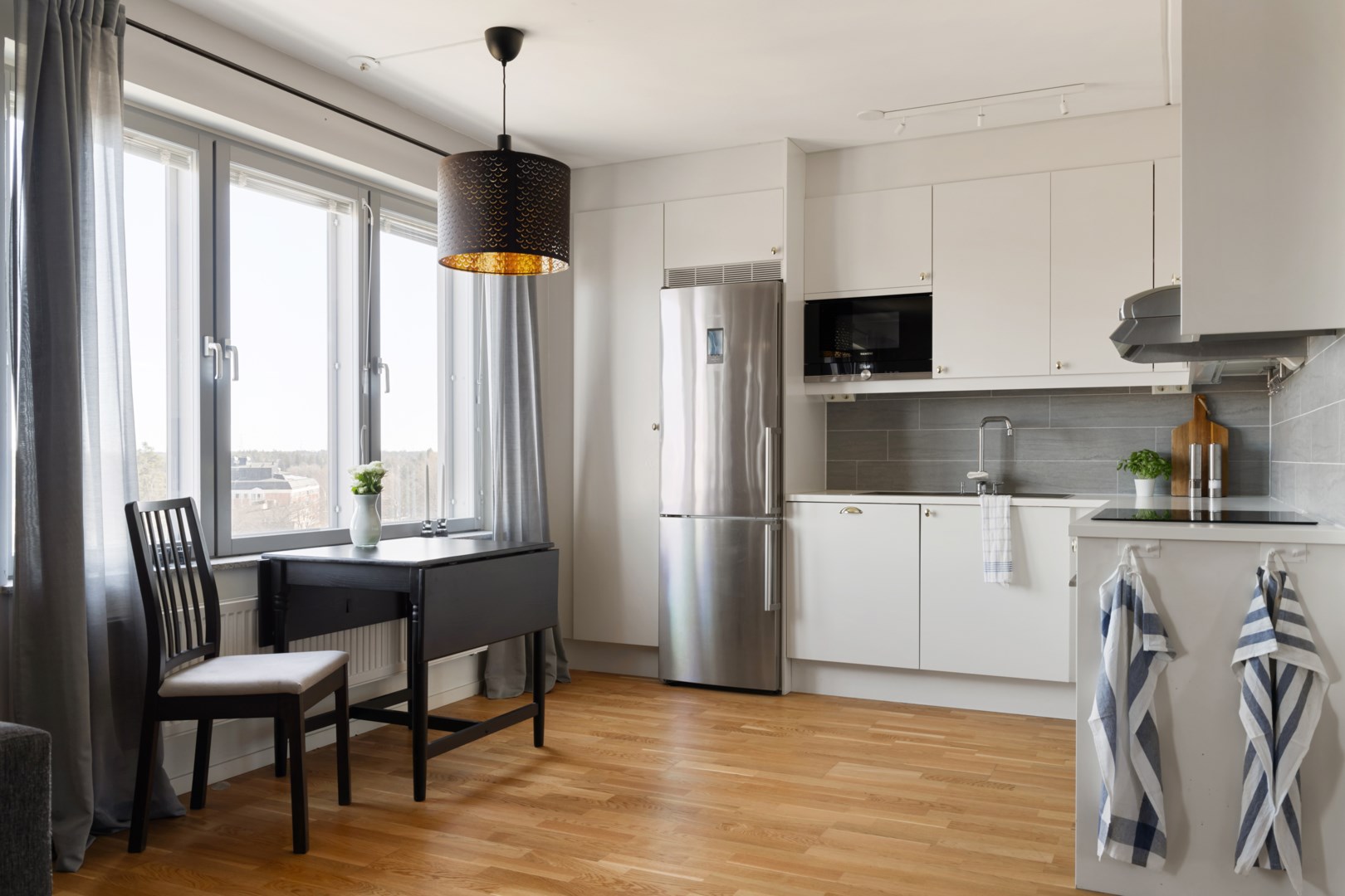 Nyproduktionskänslan infinner sig direkt, så fort man passerar tröskeln till denna lägenhet. Hallen har fräsch parkett och väggar i vitt. Plats för avhängning, förstås. Mindre sovrum som ligger i anlutning till hallen. Rummet kan enkelt användas som barnrum där du finner plats för både säng,