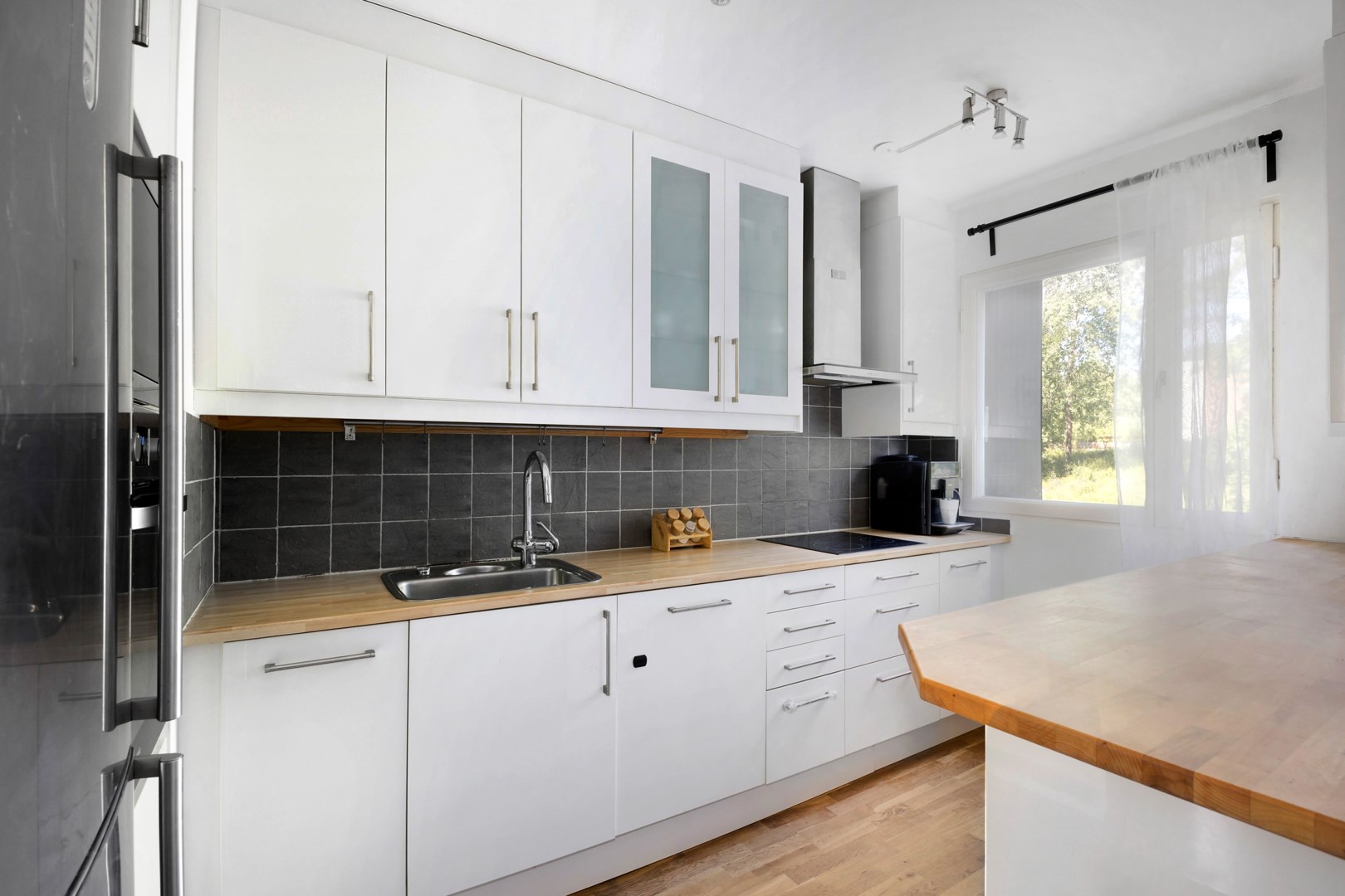 Ljus och insynsskyddad 3:a med balkong i soligt söderläge. Möblerbar hall med tre garderober och en hatthylla. Välplanerat kök med fönster mot skogsparti och separat matplats för 6-8 personer. Helkaklat badrum med tvättmaskin. Stort, ljust och insynsskyddat vardagsrum med utgång till balkong. Två