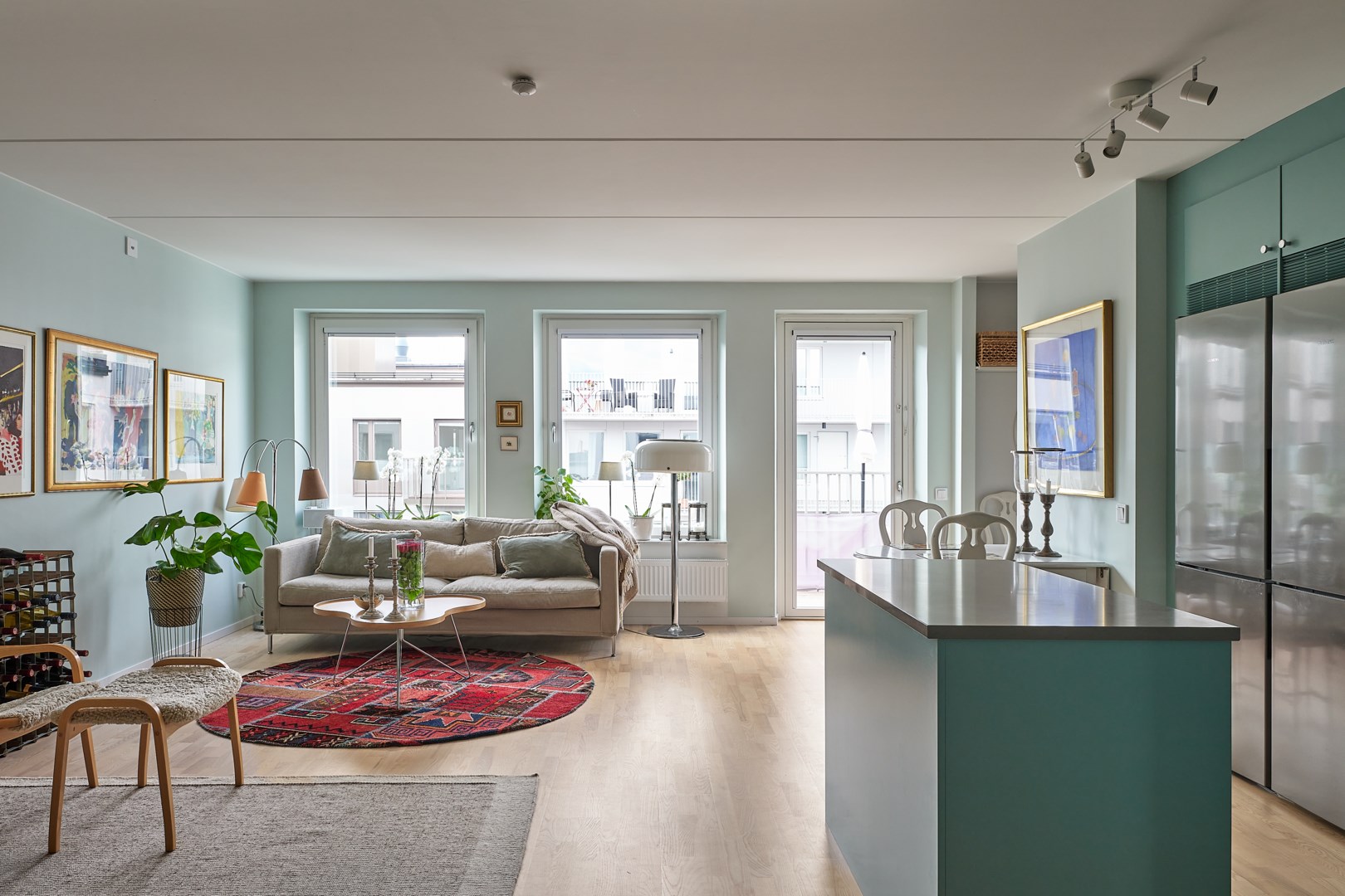 Välplanerad och genomgående ljus lägenhet högst upp i huset med två balkonger i olika väderstreck, generösa sociala ytor och harmoniska sovrum. Den öppna planlösningen mellan vardagsrum och kök skapar en luftig och inbjudande atmosfär där stora fönsterpartier släpper in rikligt med ljus. Köket från