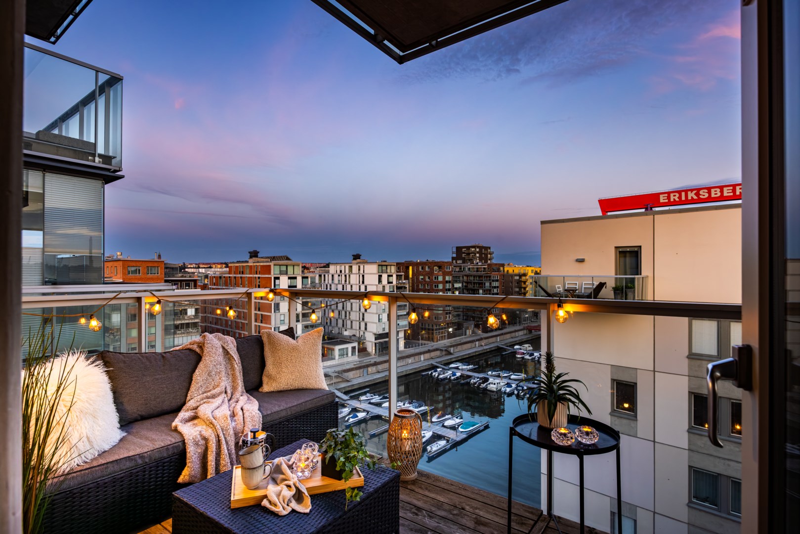 Högt upp med fin vidsträckt vy Rymlig balkong i soligt läge Ljusinsläpp från tre håll Genomgående ekparkettgolv Bredband 100/100 ingår i avgiften Soldäck & småbåtshamn utanför Garage med laddplats i huset Promenera längs vattnet Nära skolor & barnomsorg Caféer & restauranger på kajen Nära