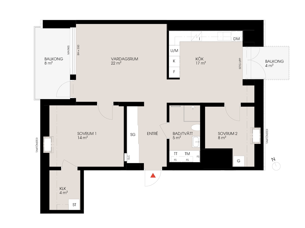 Takfönster i snedtak som ger trevligt ljus. Badrum med tvättmaskin och torktumlare.