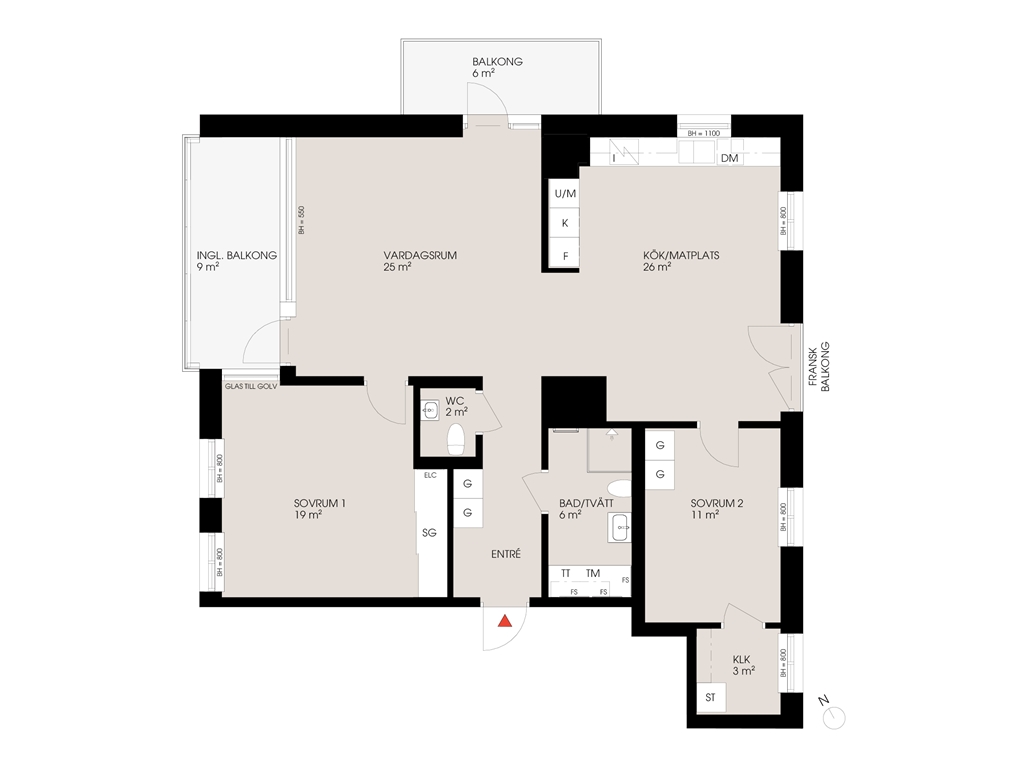 Rymligt kök med stora fönsterdörrar samt plats för matplats. Badrum med tvättmaskin och torktumlare. Gäst-wc i anslutning till entrén.