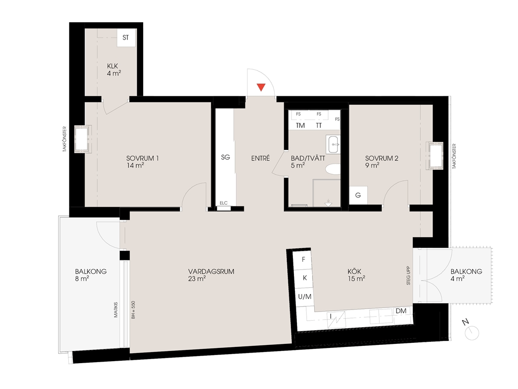 Takfönster i snedtak som ger trevligt ljus. Badrum med tvättmaskin och torktumlare.
