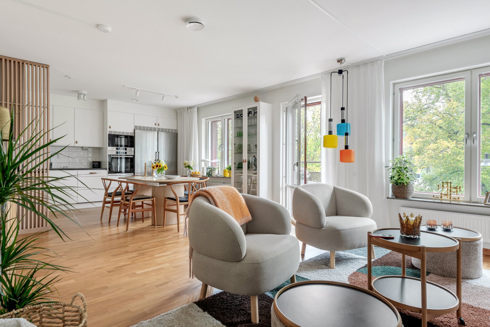 Välkommen till denna välplanerade bostad som kombinerar modern komfort med ett fantastiskt ljusinsläpp, en ljus färgsättning och generösa sällskapsytor. Den öppna planlösningen skapar en rymlig och social atmosfär, perfekt för både vardagsliv och middagsbjudningar. Här bor du med ett toppläge i