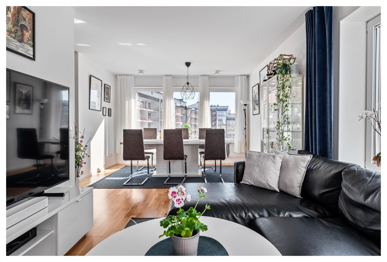 Högt upp i huset på våning 5 med ett underbart ljusflöde och fri utsikt mot innergården, ligger denna stilrena trerummare med genomgående smakfulla materialval och en härlig inglasad balkong i västerläge som förlänger säsongen från tidig vår till sent in på hösten. 3 rum och kök Brf Mariehöjd ligger