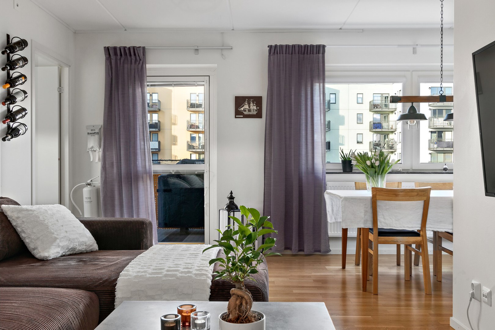Fantastiskt gårdsläge Högt upp i huset Stor balkong med grillmöjligheter Eftermiddags- & kvällssol Hörnlägenhet Stilrena materialval Hög standard Ljusinsläpp från två väderstreck Många soltimmar Himlen i blickfånget Barnvänliga kvarter Optimal planlösning Garage i huset Ingen kö till