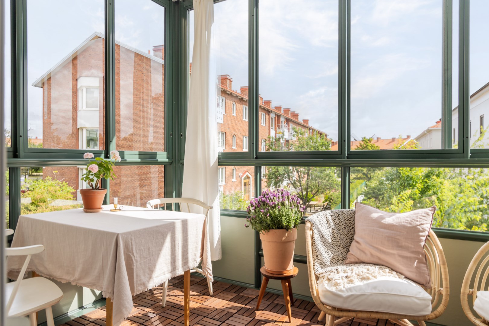 Stor inglasad balkong Härligt ljusinsläpp Yteffektiv planlösning Sobra kulörer Fina parkettgolv Matplats i köket Sovrum i bra storlek Modernt badrum Praktisk gäst-WC Inbyggd förvaring Grönskande innergård Lugnt och trivsamt område Cykelavstånd till City Kort promenad till Beijers