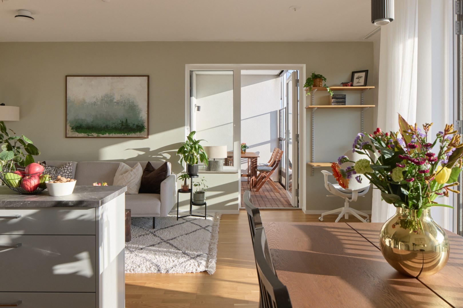 Den låga solens strålar skiner in genom generösa fönster fem våningar upp på Stora Varvsgatan 43. Moderna 77 kvadrat har havsutsikt från balkongen och milsvid strandpromenad längs Ribersborg som närmaste granne. Hörnläget tillsammans med torget nedanför ger en fri och öppen känsla i tre rum och kök.