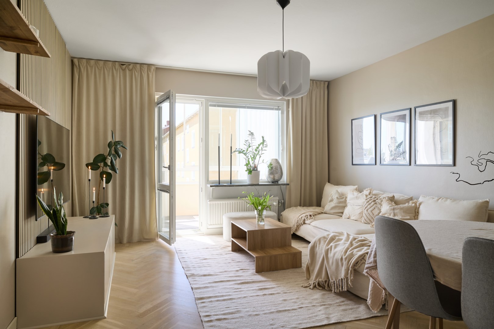 Välkommen till en ljus och genomtänkt trerummare i toppskick, helt utan insyn och med bekväm hiss från markplan. Lägenheten är nyligen renoverad och erbjuder 68,5 kvadratmeter med välplanerade ytor och fint ljusinsläpp. Den inglasade balkongen vetter mot söder och blir en solig förlängning av