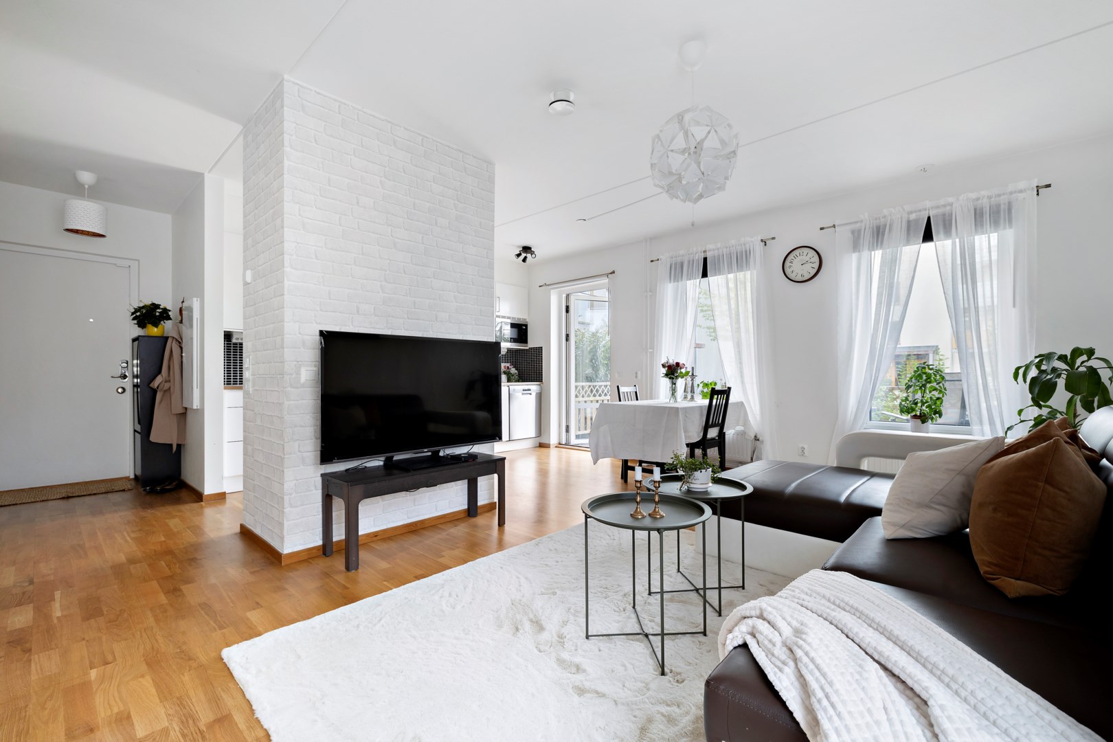 Ljus, välplanerad 3:a med stor uteplats i eftermiddags-/kvällssol. Välkomnande och möblerbar hall med hatthylla och plats för avhängning. Öppet och ljust vardagsrum med fönster i två väderstreck. Välplanerat och välskött kök med utgång till uteplats, matplats för 4–6 personer och öppen planlösning