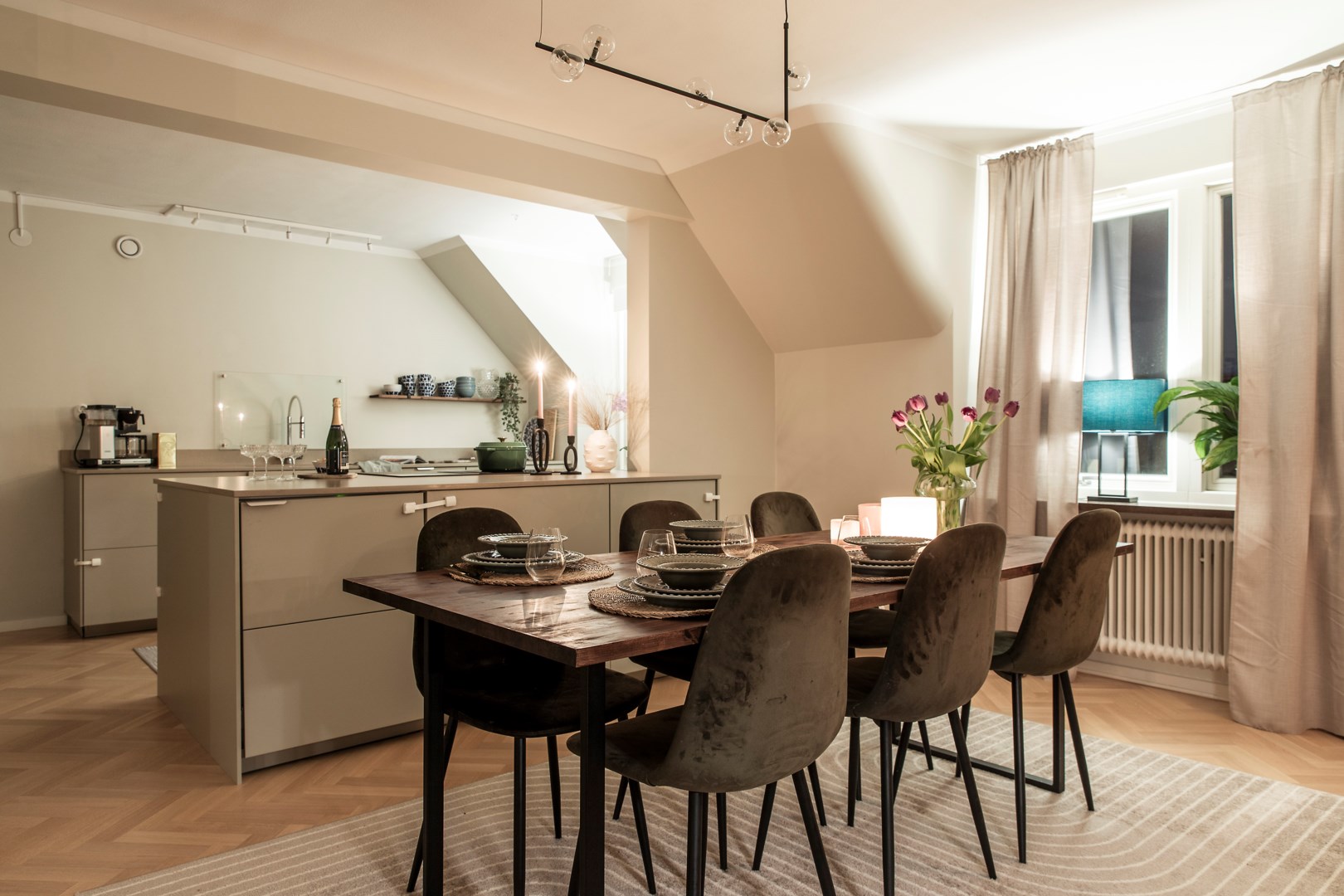 Denna fantastiska takvåning erbjuder generösa sociala ytor där modern design harmonierar med bevarade tidstypiska originaldetaljer, som den vackra fiskbensparketten, stora fönsterpartier och sneda takpartier som smidigt övergår i mjukt rundade hörn, vilket ger bostaden en unik och charmig
