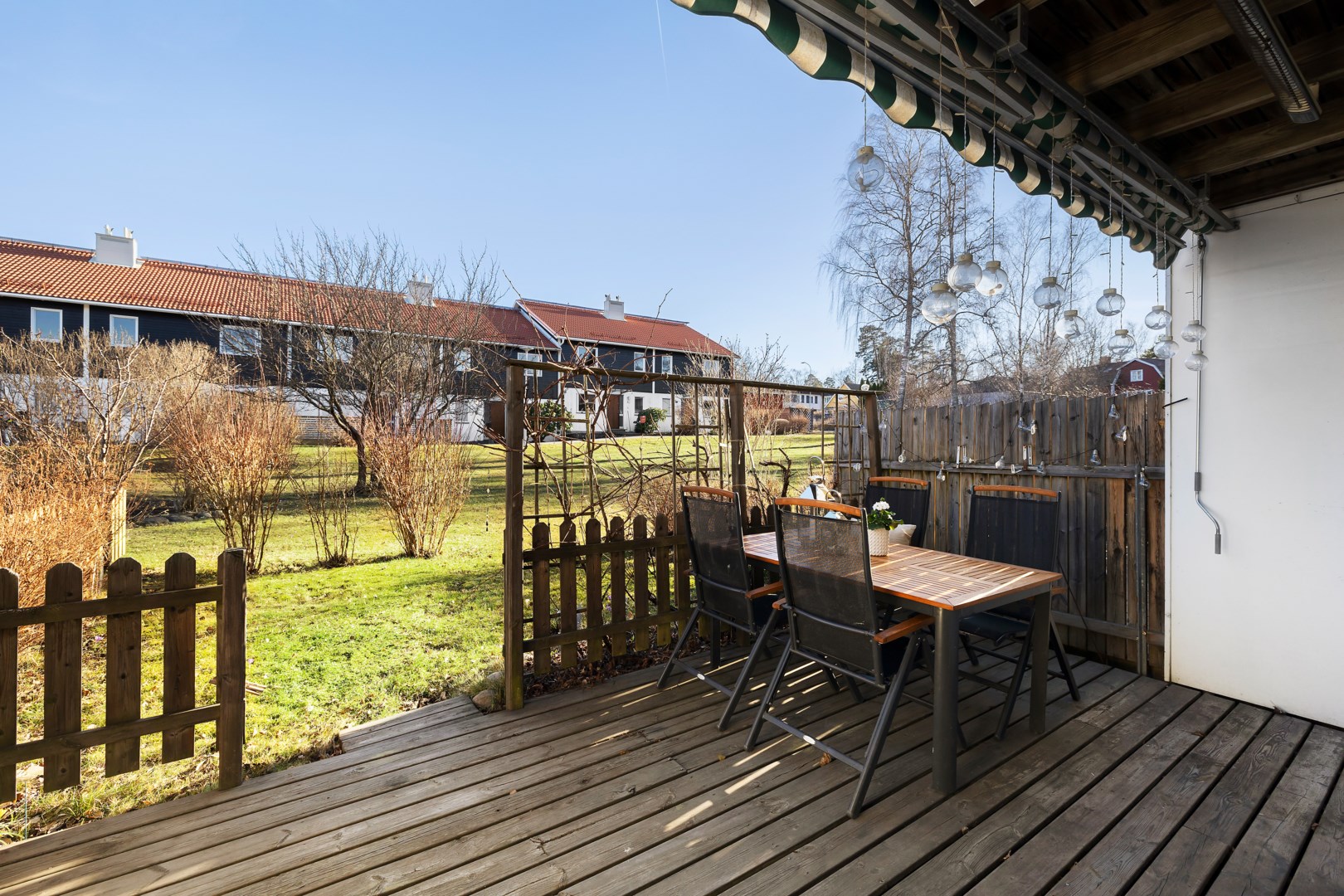 Renoverat och välplanerat BR-radhus i två plan beläget i ett lugnt, barnvänligt område med närhet till natur. Bostaden har en uteplats vid entré med träaltan och körsbärsträd och en solig uteplats på baksidan med gräsmatta samt träaltan delvis under tak med markis. Radhuset har väldigt bra solläge