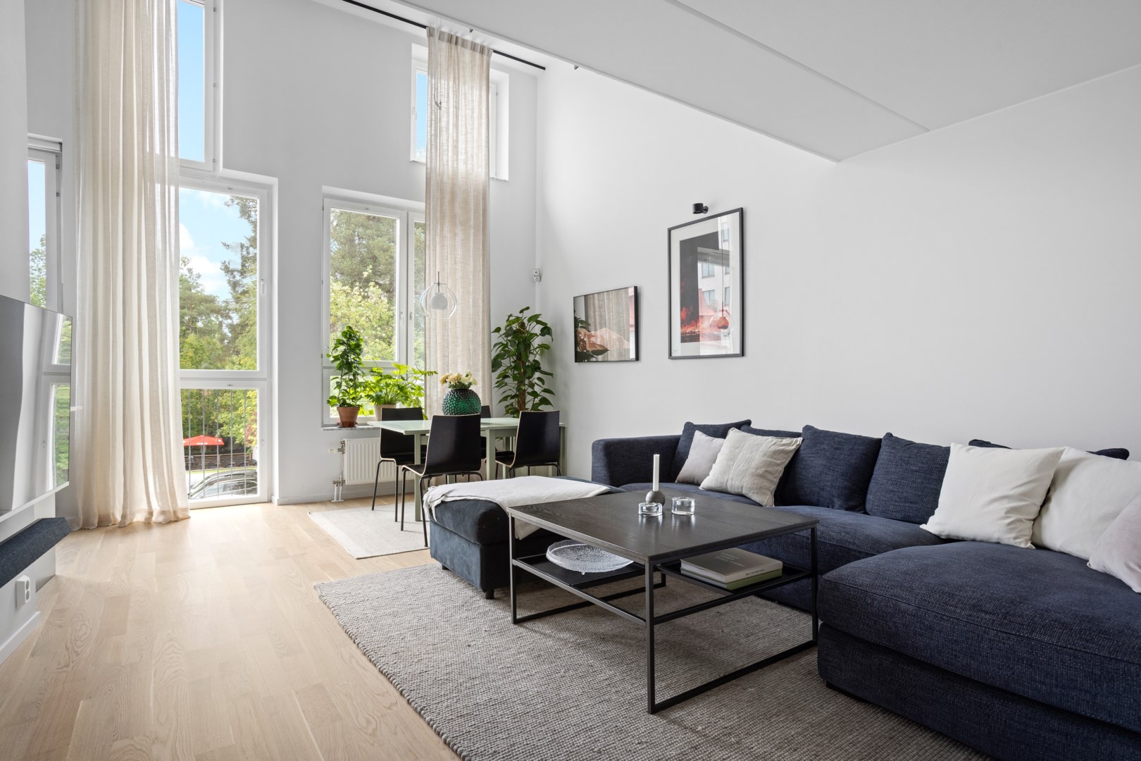 Nylagt golv - Renoverat kök - 5m i takhöjd - Kvällssol på balkongen - På en lugn återvändsgata mitt i mysiga Mariehäll som är beläget intill Sundbyberg och Bromma Blocks, får jag nu lov att presentera detta premiumboende i två plan med radhuskänsla och en takhöjd på uppåt 5 meter! Entréplanet