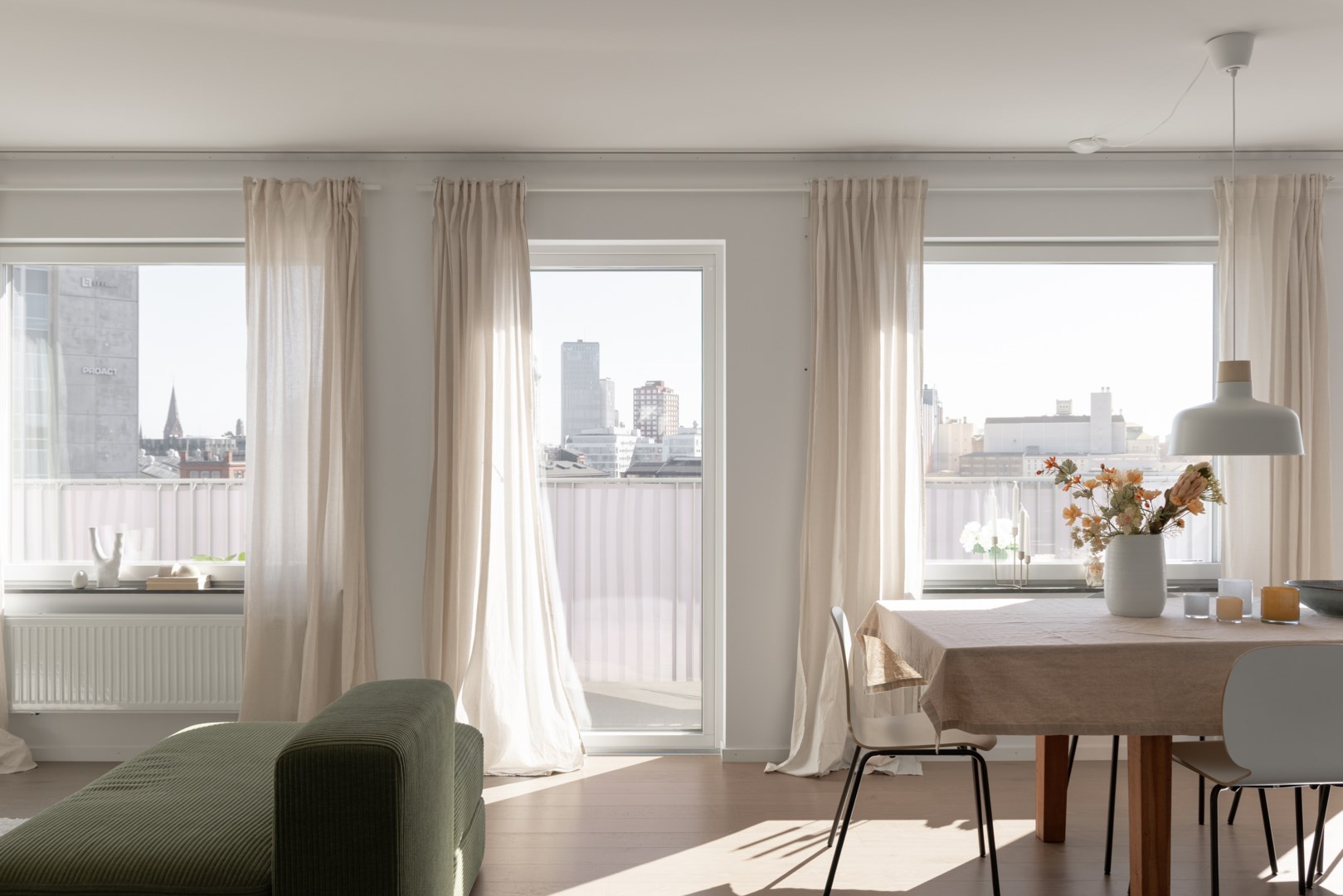 Radhuskänsla på taket Dubbla terrasser Härlig utsikt Optimal planlösning Ljus & luftig atmosfär Generösa sällskapsytor Nytt & fräscht Två badrum Praktisk tvättavdelning Gott om förvaring Hiss från markplan Gästlägenhet i föreningen Trevlig innergård Intill Läparken Gym över gatan Nära