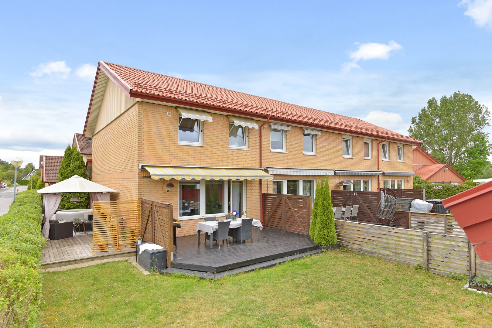Värme, vatten, kabel-tv samt bredband ingår i avgiften. Varmt välkomna till detta charmiga insynsskyddade gavelradhus i populär bra förening. Här bor ni med ett av områdets allra bästa läge. Två fina och stora lekparker finns i området samt fotbollsplan. Stor altan som sträcker sig runt hela