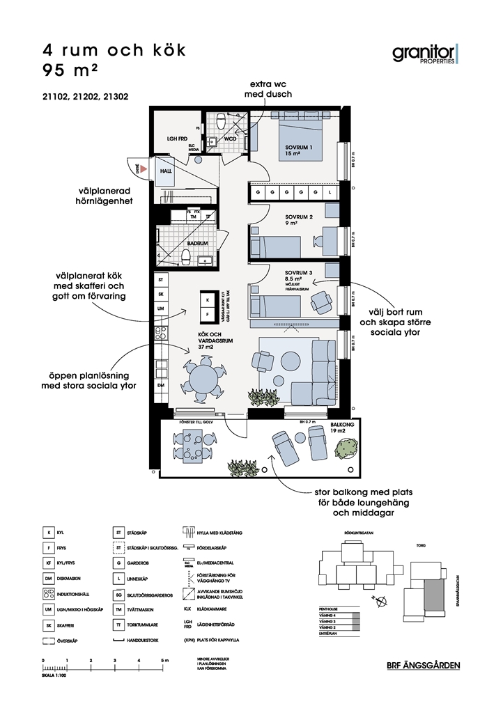 Ljus välplanerad hörnlägenhet med stor balkong på ca 19 kvm med kvällssol. Välplanerat kök med gott om förvaring. Öppen planlösning med stora sociala ytor. Möjlighet att välja bort ett rum för att skapa ännu större sociala ytor. Generöst badrum med tvättmaskin och torktumlare. Extra WC med Dusch.