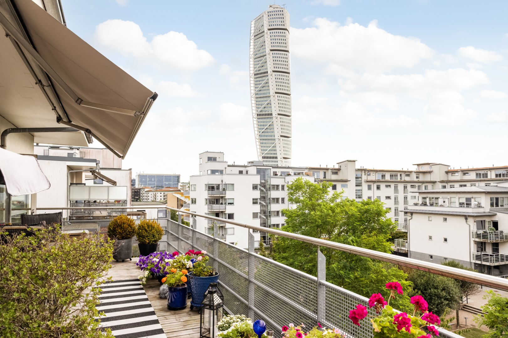 Högst upp på Signalgatan 6 hittar du denna ljusa och luftiga bostadsrätt med 98 välplanerade kvadratmeter. Här bor du högt upp med magnifik utsikt över Västra Hamnen och Turning Torso, och med två soliga terrasser där du kan njuta av både morgonkaffe och ljumma kvällar. Den höga takhöjden på 2,70