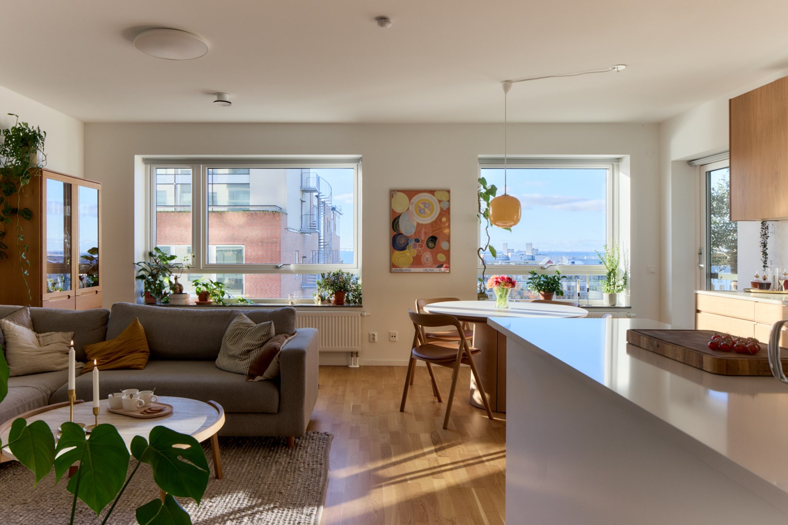 Den milsvida utsikten över Öresund och Västra hamnens hustak är det första som slår en när man kliver in i denna våningen - himmel och hav i ljuva blåa toner! Det är moderna kvadrat på åttonde våningen med fri havsutsikt från både kök, sällskapsrum och två av de tre sovrummen. Generösa fönster och