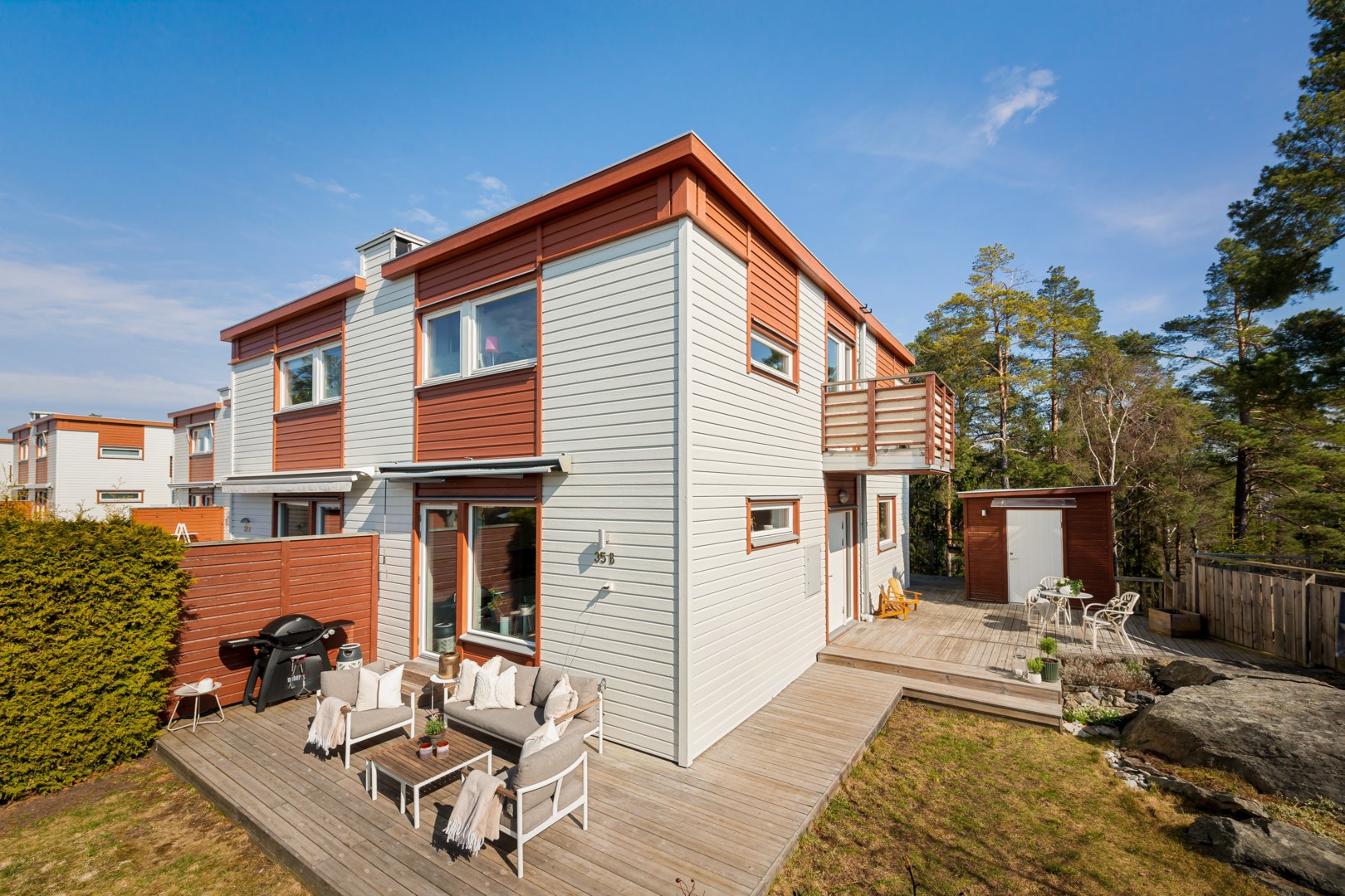 Välkommen till detta trivsamma BR-parhus i barnvänliga och naturnära Älta. Bostadens trädeckade altan i bästa solläge sträcker sig runt hela bostaden och gör att du kan välja en trivsam plats i sol eller skugga under hela dagen. Ljust och inbjudande vardagsrum med braskamin som tillför extra värme