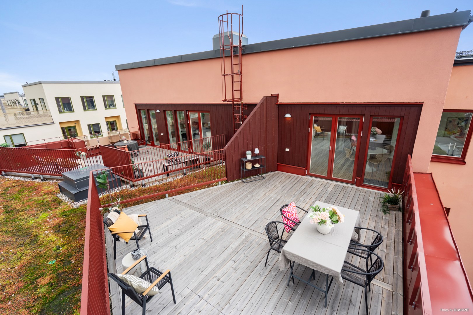 Nyproducerad 4:a på 104 kvm med ett fantastiskt läge med utsikt mot områdets villor. Underbar terrass i ett västligt soligt läge på 35 kvm med sol från tidig eftermiddag till sent på kvällen. Den andra takterrassen är 11 kvm och har morgonsol. 4 rum varav 3 sovrum Inom korta avstånd finns de flesta