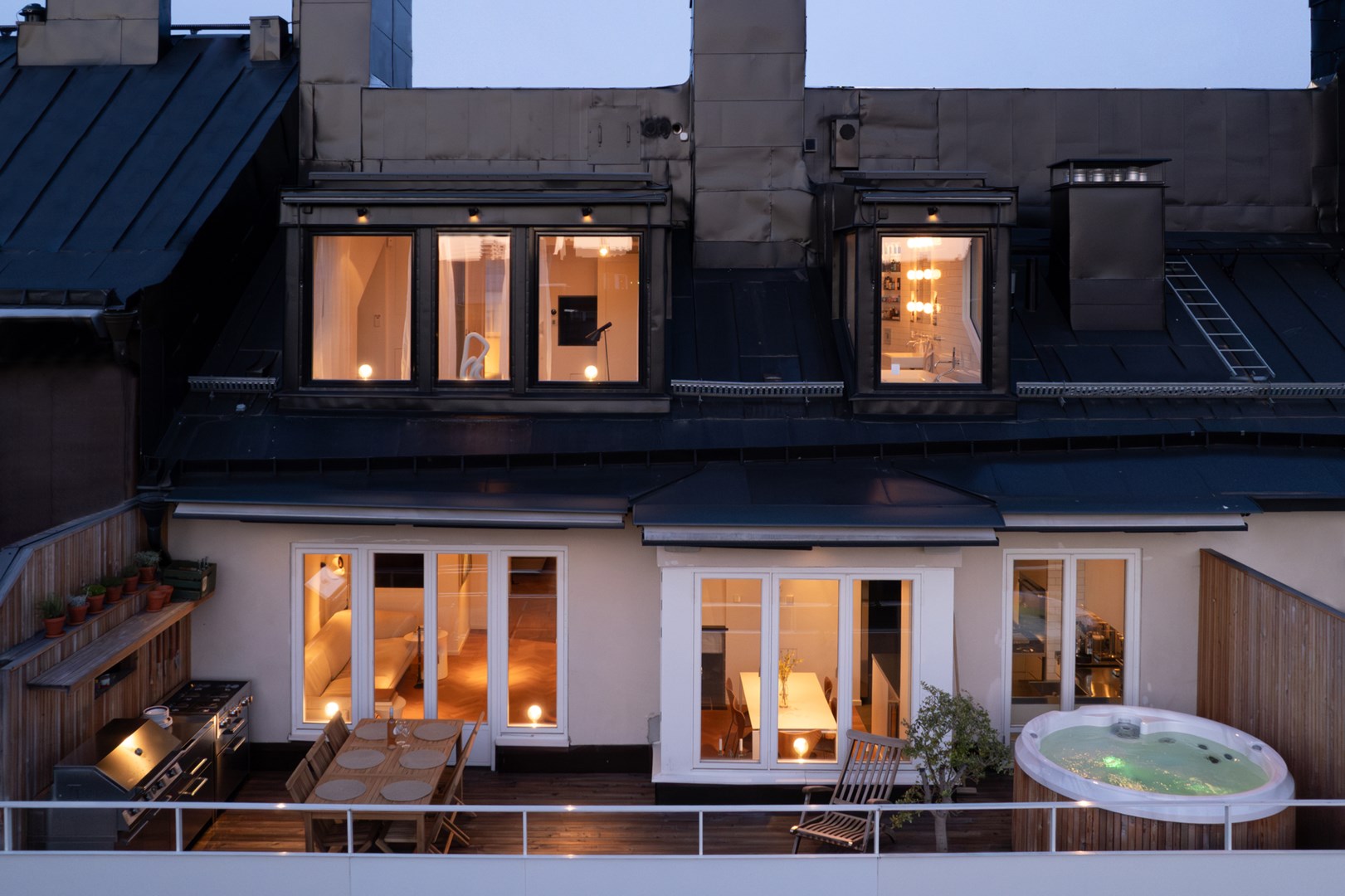 Penthouse med stor terrass med utekök invid Östermalmstorg och Humlegården. 142 kvm i två plan och terrass i sydväst om 29 kvm med Jacuzzi och komplett utekök. Möjlighet till garageplats i fastigheten.