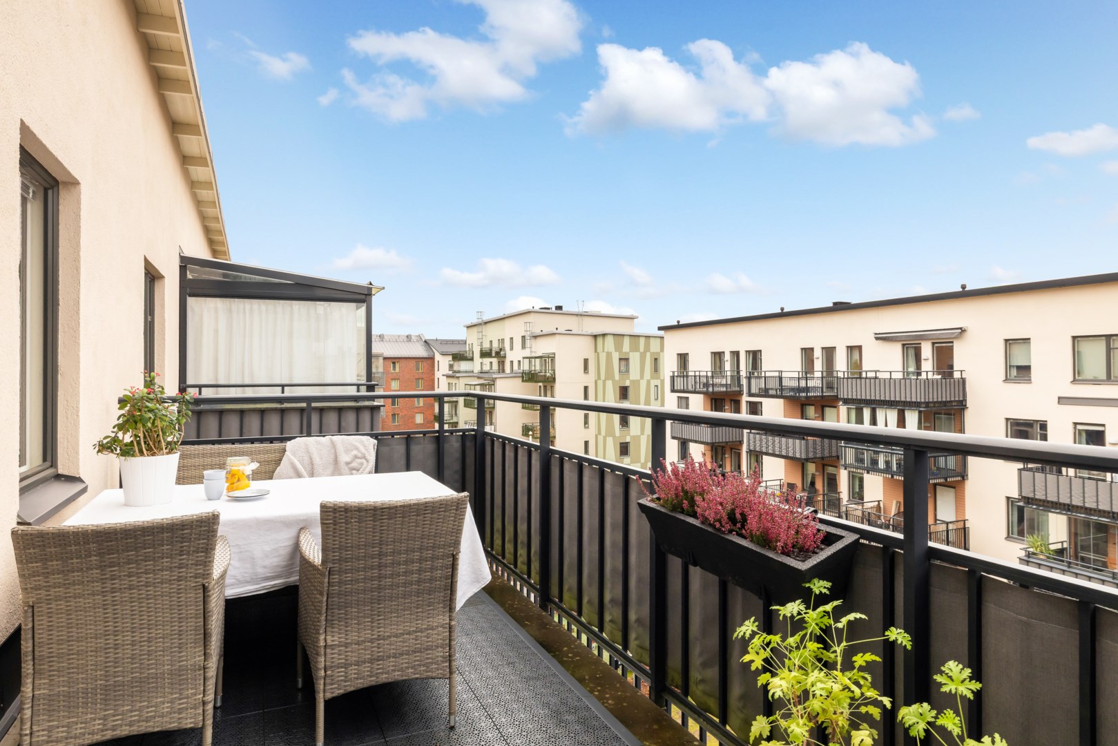 Högst upp i huset ligger denna våning på 119 kvm, fördelade i dagsläget på fem rum med kök som erbjuder både inbjudande sociala ytor och många rum. De två balkongerna ligger utmärkt vända i olika väderstreck vilket ger dig som bor här möjlighet att njuta av både soluppgång och solnedgång. 5 rum