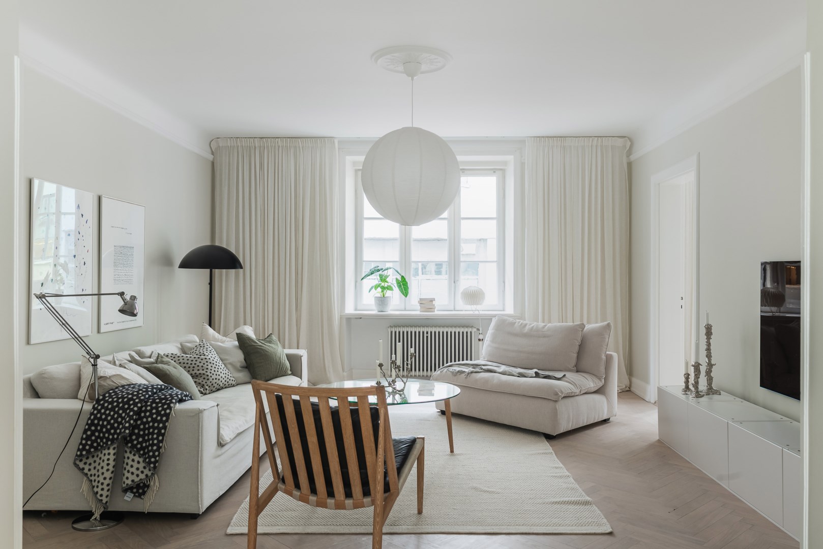 Totalrenoverad 2024 Fiskbensparkett & brädgolv Pampiga rum i fil Genomgående planlösning Lamprosetter & höga golvlister Påkostade materialval Enhetligt & stilrent kök Bevarade dubbeldörrar Generös takhöjd Goda förvaringsmöjligheter Stilrent badrum & gäst-wc Egna tvättmöjligheter