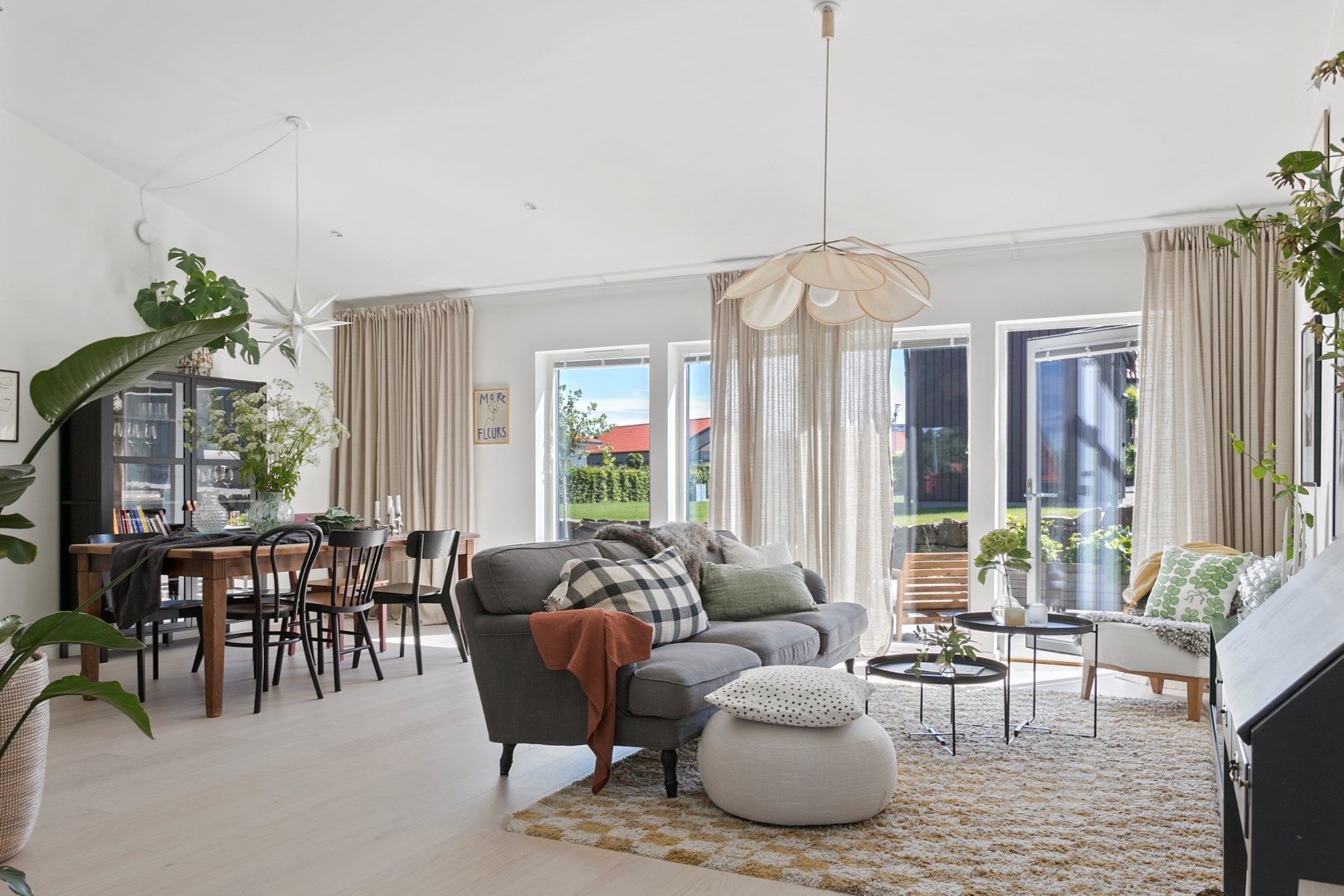 Huset är ett vackert och ytterst genomtänkt enplanshus med fyra sovrum. Här finns generösa sociala ytor med ljus och rymd kombinerat med privata utrymmen, med andra ord: just det som så många av dagens husdrömmar innehåller. I den väl tilltagna entrén välkomnas du med fri sikt rakt igenom huset
