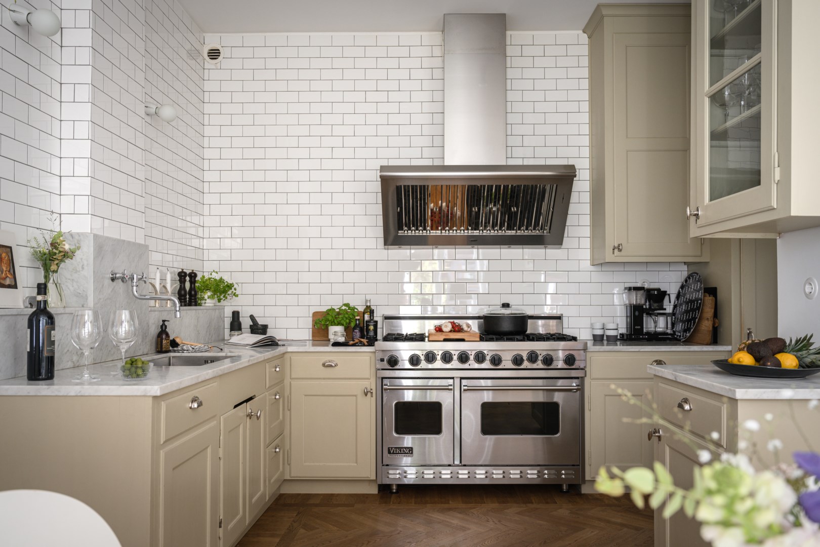 I ett palatsliknande hus från förra sekelskiftet, väl utsmyckat med detaljrika ornament, pampiga balkonger, burspråk och dekorativt tegel, sträcker paradvåningen ut sig på 170 kvm generösa kvadratmeter. I samtliga av de sex rummen är det samma enhetliga uttryck som råder; byggårets karaktär och
