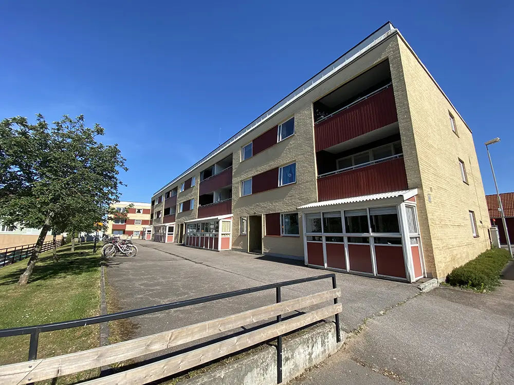 Rymlig trea högst upp i fastigheten med bra balkong i söderläge. Ett större och ett mindre sovrum. Badrum med badkar. extra Wc med toalett och handfat. Vardagsrum med ljusinsläpp från två håll. Gemensam tvättstuga i källaren. Matbutik knappt 10 minuter bort. Frisör och andra butiker närmre än