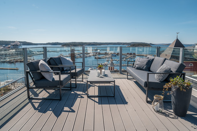 Högst upp i huset på Södra Bergsgatan 3 i Strömstad ligger denna fantastiska och mycket påkostade penthousevåning, den största i föreningen. Våningen om 214 kvm har generösa sociala ytor och fyra möblerbara terrasser i olika väderstreck med strålande havsutsikt. Genomgående i lägenheten ligger ett