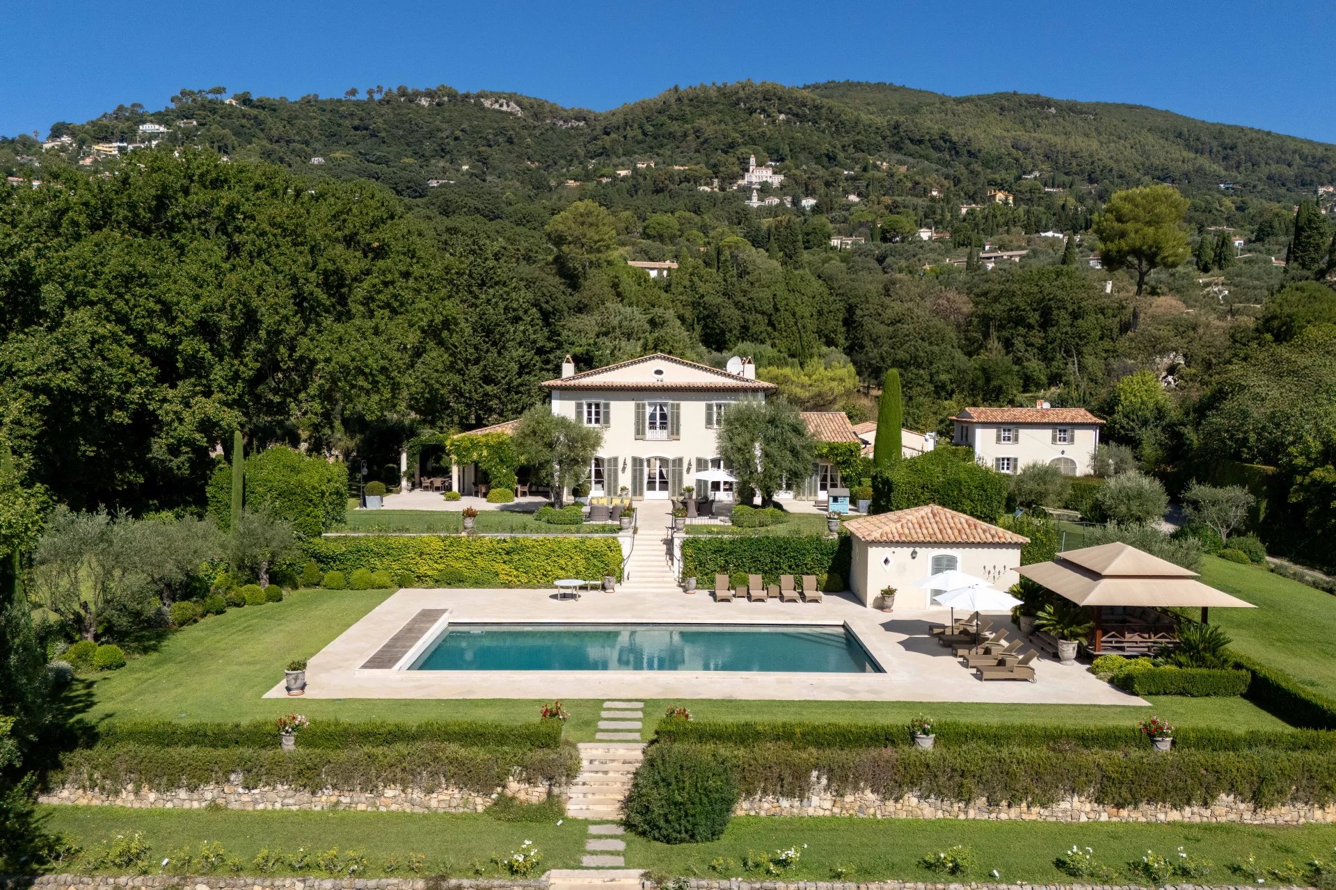 Exceptionell egendom: 1,1 ha anlagd park med förfinat lanthus, swimmingpool, tennisbana, gästhus och vaktmästarstuga Denna exceptionella fastighet ligger i hjärtat av det fridfulla och eftertraktade bostadsområdet Grasse Saint-Mathieu och erbjuder en sällsynt kombination av diskretion, elegans