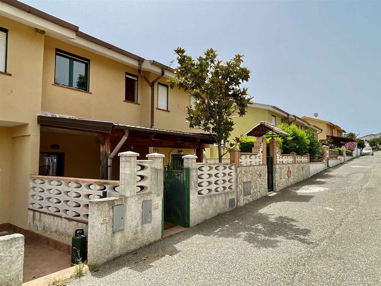 Radhus med front havsutsikt och trädgård till salu i Borgo Roseto, Roseto Capo Spulico. Samfällighetsavgifterna är låga och komplexet har inga tilläggstjänster utöver ordinarie städning, extern belysning och administratörsavgift. Området är väldigt lugnt och det råder ingen brist på