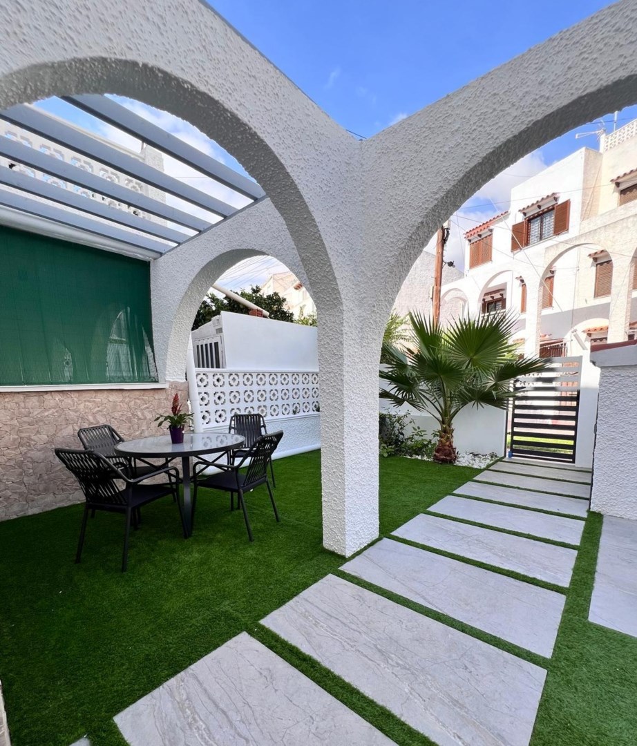 Välkommen till detta vackra och smakfullt renoverade parhus i det eftertraktade området Calas Blancas, Torrevieja! Bostaden disponeras över två plan och kombinerar modern stil med medelhavscharm. Här finner du tre rymliga sovrum, två eleganta badrum, ett ljust och inbjudande vardagsrum samt ett