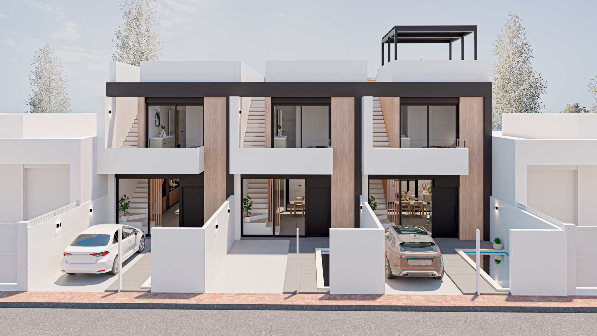 Nu presenterar vi detta moderna bostadskomplex med tre radhus i San Pedro del Pinatar! Radhusen består av 3 sovrum, 2 badrum med privat pool, terrass, privat takterrass och parkeringsplats. Designade med en modern stil och öppet planlösning. Här finns gott om plats för att umgås tillsammans med