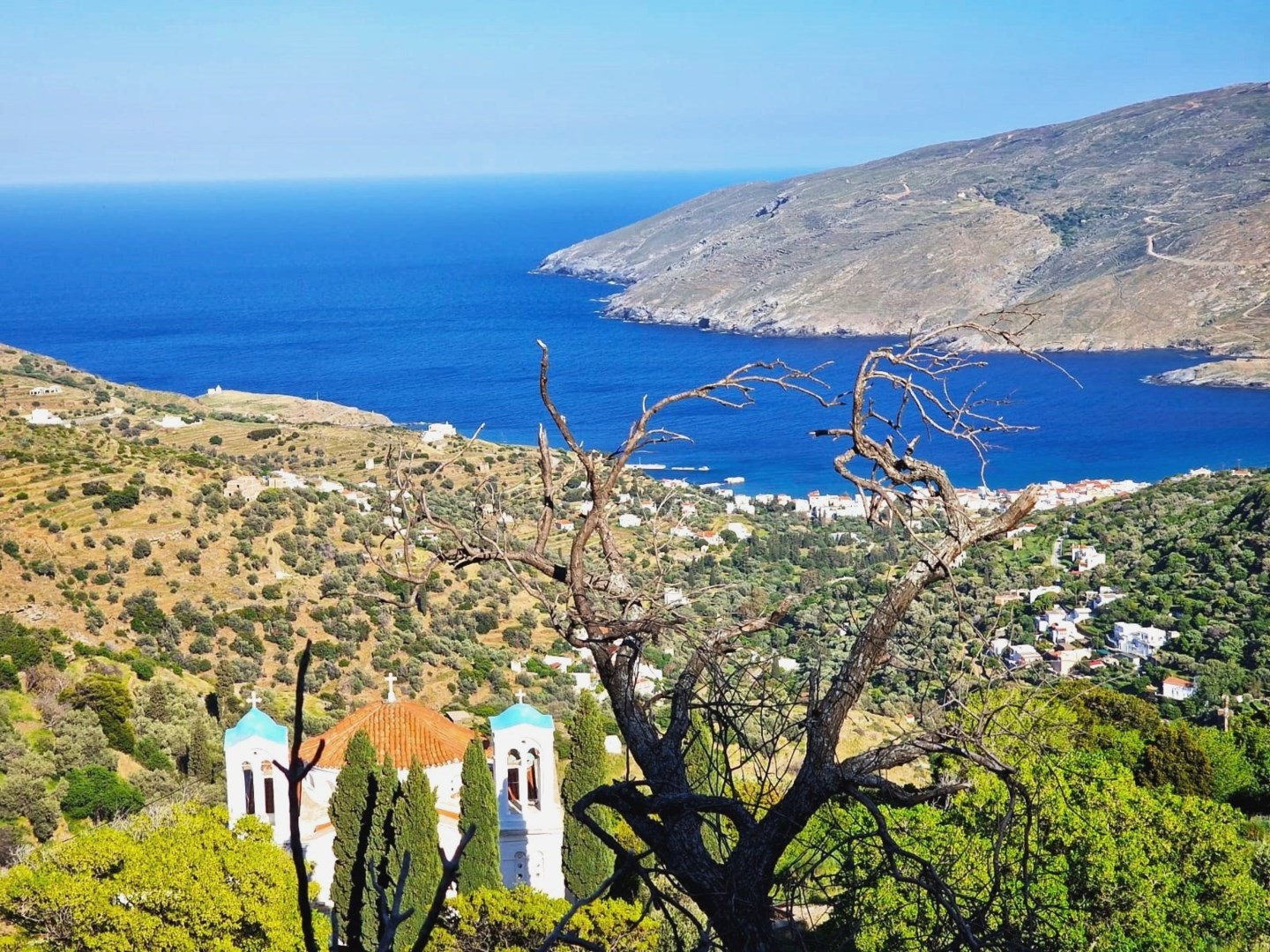 Välkommen till Andros Agia Marina, en pittoresk del av ön Andros i det Egeiska havet. Bara två kilometer från den charmiga byn Agia Marina ligger denna underbara tomt med ett traditionellt grekiskt stenhus, omgivet av enastående natur. Beläget högt upp i bergen, erbjuder denna tomt en spektakulär