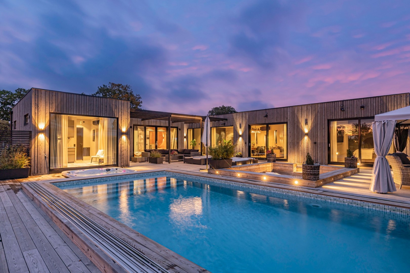 Bakom den arkitektoniskt strama fasaden döljer sig en värld av ljus, form och genomtänkt design. Här har ingenting lämnats åt slumpen – varje detalj, materialval och linje samspelar i en helhet som både imponerar och berör. Bostadshuset om ca 100 kvm, det fristående gästhuset på ca 30 kvm och den