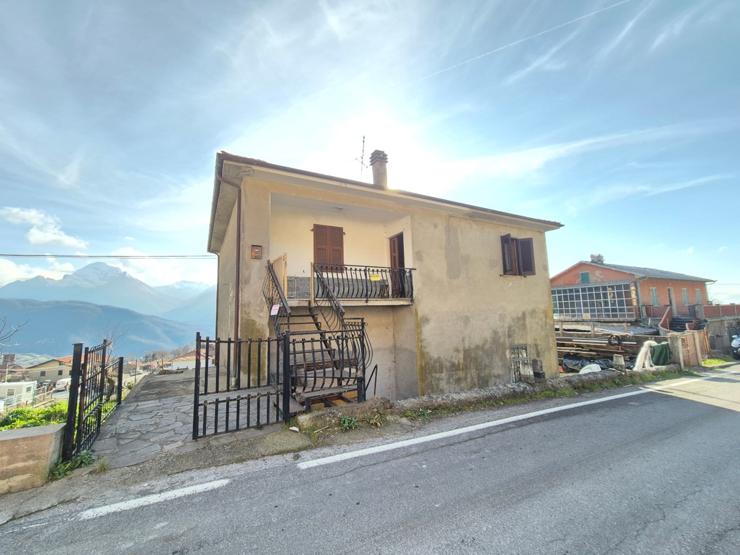 4-rumslägenhet till salu på övervåningen med liten gemensam trädgård i utkanten av byn Metra, medprivat parkering. Panoramautsikt över Apuanska bergen. Centralvärme med vedspis i köket. Parkering efter infarten till fastigheten via grind från vägen. Trappa till övervåningen och lägenhet med balkong.
