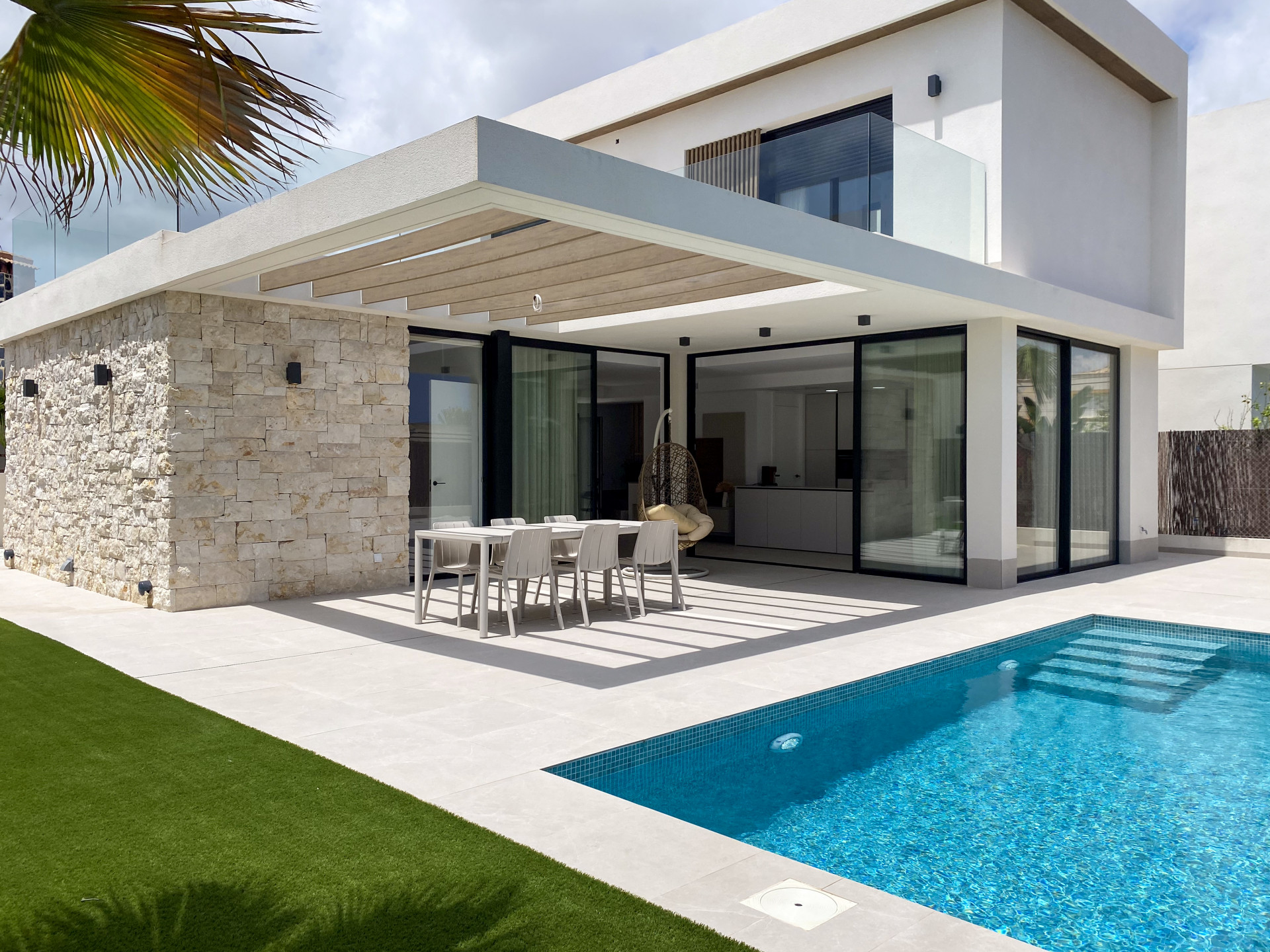 Vi är glada att kunna presentera denna fantastiska och exklusiva villa, belägen i det eftertraktade området Lomas de Cabo Roig på den vackra Costa Blanca. Bostaden är modern, ljus och rymlig med en öppen planlösning som skapar en luftig och inbjudande känsla.Villan erbjuder tre generösa sovrum, två