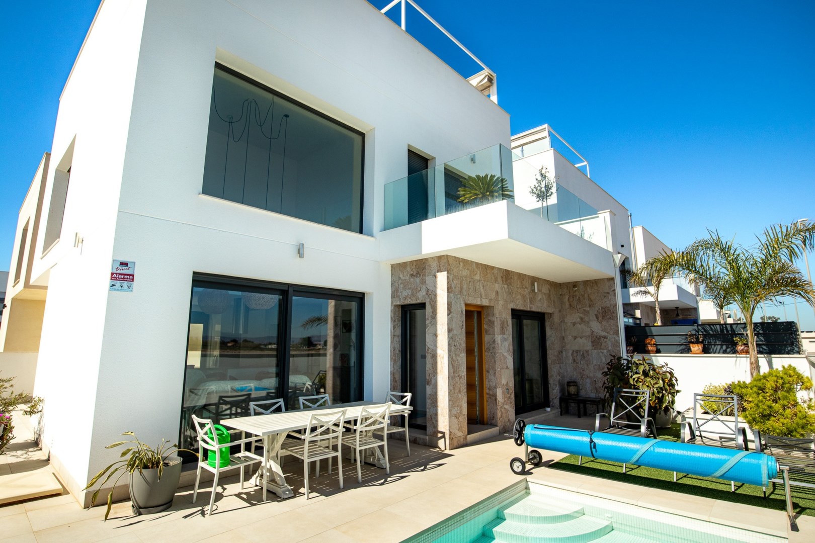 Välkomna till denna exceptionella fristående villa i Daya Vieja på Costa Blanca, där modern komfort möter lugnet från det öppna landskapet. Här bor du i en fridfull bymiljö med en oslagbar känsla av rymd och avskildhet, tack vare läget mittemot skyddad jordbruksmark som garanterar fri utsikt över de